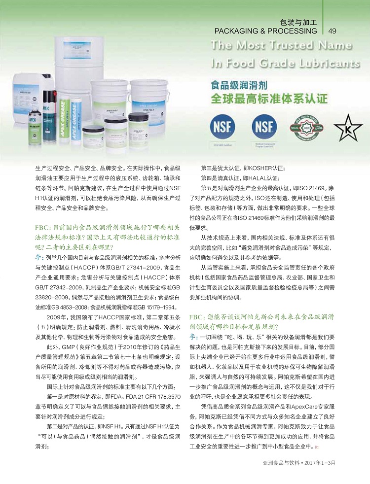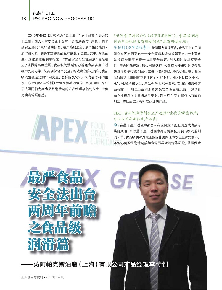 q期国际知名杂志《亚z食品与饮料》对阿帕克斯q行了专访报道,食品润滑...