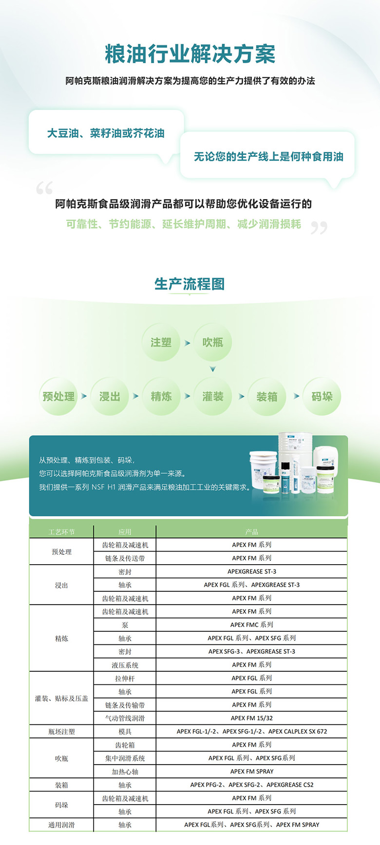 从预处理、精炼到包装、码垛,(zhn)可以选择阿帕克斯食品U润滑剂为单一来源。我们提供一pd NSF H1 润滑产品来满粮油加工工业的关键需求?/span>